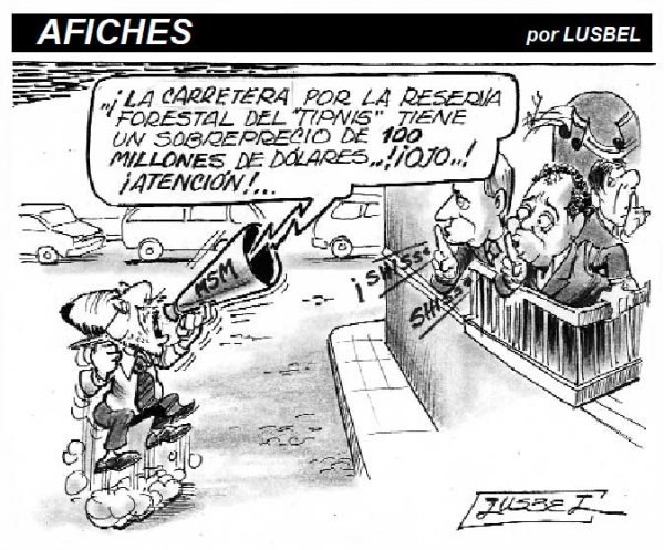 The head of a political party, formerly allied with current government is shouting: “the road through the ‘TIPNIS’ forest reserve has a surcharge of 100 million dollars…! Hey! watch out!..” while government officials intend to quiet him down…
