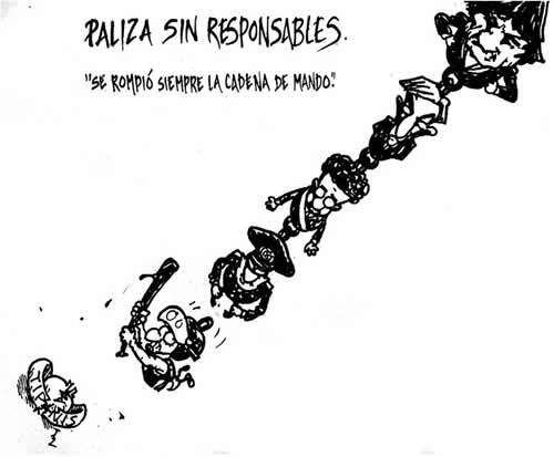 TIPNIS’ 9th protest-walk is under fire, this cartoon is from El Dia, March 27, 2012. It reads “Beating without responsible ones” and below that: “the chain of command was broken!” so that the cruel, unnecessary beating from the police force to the 8th protest-walk of last year’s. No one takes the responsibility for that atrocious act.