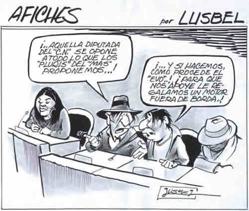 assembly person 2: “… and if we do like ‘evo’..! so she supports us, we gave her an outboard motor as a gift..!” [in clear allusion to the number of outboard motors and other ‘gifts’ that the government through the president, executive government officials and even military, have been giving away to people inside the TIPNIS, in order to get support to the poll in favor of the road that would cut in half the indigenous territory and the National Park].