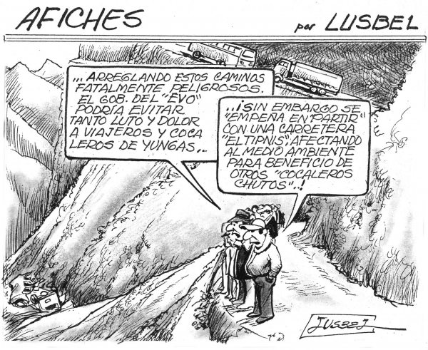 This cartoon is from El Diario, June 16, 2012: Dialogue first person “…fixing these fatally-dangerous roads, the government could avoid so much mourning and pain to the Yungas travelers and coca growers…”; second person “..nevertheless, they stubbornly intend to ‘cut’ with a road the TIPNIS. affecting the environment in benefit of other “chuto coca growers”..!” [chuto means illegal, also referring to the large quantity of junk cars smuggled into this country]