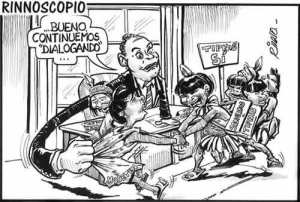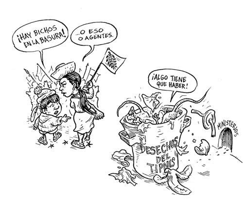 While in the trash can, the scavenger is going after the TIPNIS trash, looking for some “proof” that they can use against the TIPNIS group, the hole in the wall reads ‘ministries’