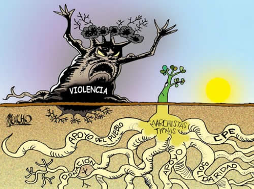 You see violence as a big dark tree, threatening the TIPNIS Marchers, with deep roots: support from the people, grants, support, solidarity and the Constitution.
