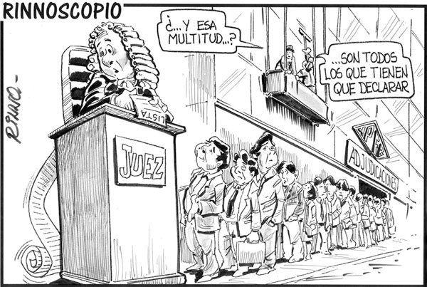 With respect to the program of industrialization, which has a budget of 4,090 billion dollars to implement liquefied plants, Rio Grande and Gran Chaco, and urea and ammonia in the tropics of Cochabamba, in the 2010-2012 period, Del Granado said they are very late and outdated schedule, since none of the potential partners (foreign Enarsa, Brastem, NPCI and Pequiven) showed the slight interest in investing in such projects of industrialization. [this cartoon is from El Diario, July 15, 2012. A long line to see a judge, in the front of the luxurious YPFB offices, two window cleaners talking: “…and that crowd..?” the other says “…they are all the ones who have to declare” on the multiple cases of alleged corruption inside YPFB, this year alone]