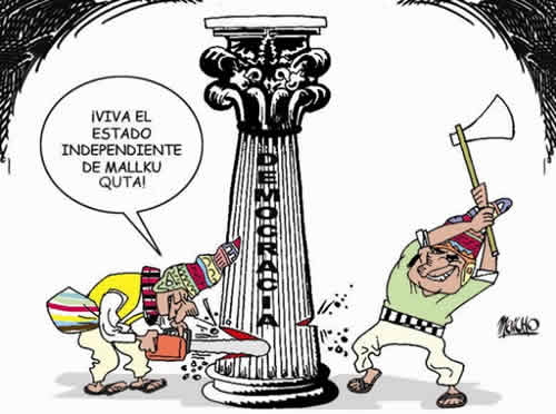 Avernoy as he does the political sign of the MAS [remember that every dictator creates his own sign to demonstrate power and authority, remember Mussolini, Hitler?]: “go ahead community brothers of Suk’Awaña, lets follow the footsteps of Mallku Khota!”