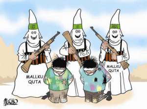 three smiling and probably “proud” indigenous armed people, with a “KKK” unfortunate appearance from Mallku Quta, and two of the hostages, representing all their suffering…