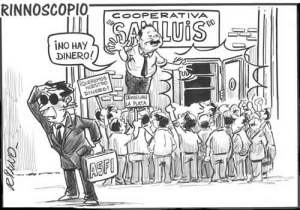 The cartoon above is from El Diario, August 10, 2012, a savings and loan coop, San Luis, has gone belly up and there is no money to repay those who trusted their savings; while the ASFI, Bolivian governmental entity designed to take care of these type of issues, is practically watching the other way and saying they do not have to intervene.