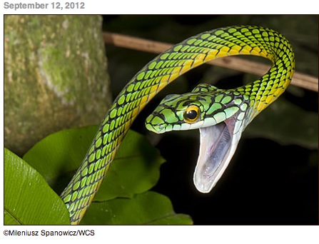 With help from WCS, the Bolivian Park Service released a new compendium documenting the abundant plant and wildlife found within Madidi National Park. The natural haven houses more than 200 mammal species, 11 percent of the world’s birds, and the vibrant parrot snake, photographed as it slithers through the trees.