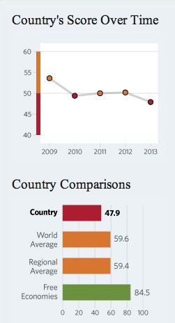 Bolivia’s economic freedom score is 47.9, making its economy the 156th freest in the 2013 Index. Its overall score is 2.3 points worse than last year, reflecting a significant erosion of investment freedom, labor freedom, and monetary freedom. Bolivia is ranked 25th out of 29 countries in the South and Central America/Caribbean region, and its overall score is far below the world and regional averages.
