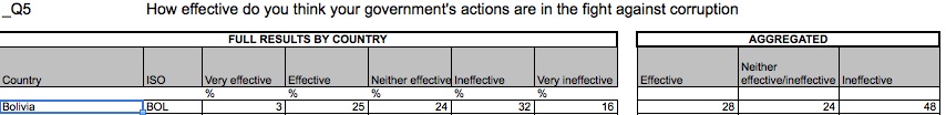 [Most of the Bolivians surveyed say it has increased a lot, 37%. And aggregate is 57%, whereas this is a time where information is no longer power, and that people can express publicly – internet – their concerns, it is undeniable that during this government, Bolivia has more corruption than ever, at all levels.]