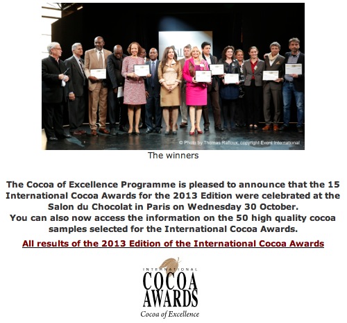 The Cocoa of Excellence Programme is pleased to announce that the following 15 International Cocoa Awards for the 2013 Edition were celebrated at the Salon du Chocolat in Paris on Wednesday 30 October.