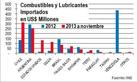 November 2013, Bolivia imported a total of $1,101 million dollars in fuels and oil lubricants; $312.6 MM from Chile, $256.3 MM from Argentina and $132.6 MM from the United States.