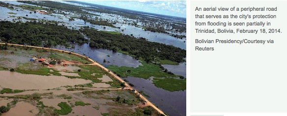 Bolivia’s minister of defense, Ruben Saavedra, has rejected Mr. Lens’ request, and said the government will distribute national and international aid to affected areas. Severe flooding is a fairly frequent occurrence in Bolivia, and some observers say that President Evo Morales is determined to prove that Bolivia can successfully manage its own relief efforts during an election year. [I would also say that he also is desperately wanting to hold the G77+China meeting for the same illegitimate re-re-election.]