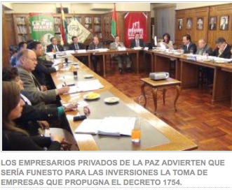 The president of the Federation of Private Employers of La Paz (Feplp) Urquizo Luis Valdivia, expressed this Friday [3/14/14] his concern of the threat from factory workers about turning 12 factories from the private sector to “social enterprises” under the pretext that they were bankrupt or in financial trouble.