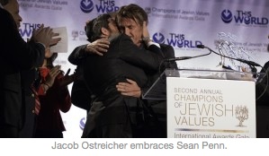 “I spent two weeks rolled up in a fetal position in Sean’s house… and through it all, Sean sat with me for hours, sometimes sitting with me all night, rubbing my back, saying quietly, ‘Stay strong Jacob, give yourself some time,’” Ostreicher said in a speech at Rabbi Shmuley Boteach’s This World: The Values Network’s Champions of Jewish Values International Awards Gala, where Penn received the organization’s Champion of Jewish Justice Award.