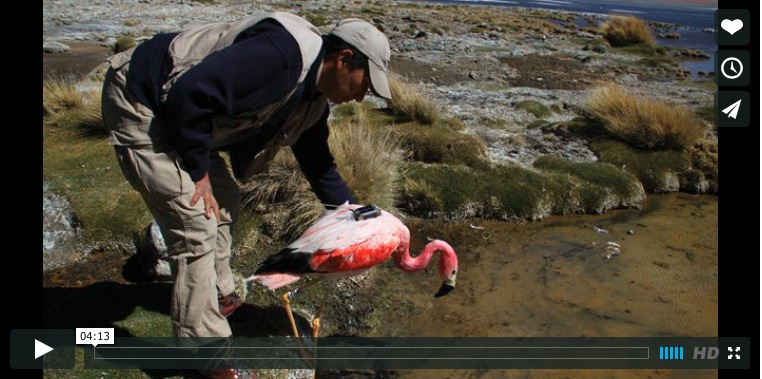 After a week, we managed to harmlessly capture, fit and release a total of five Andean flamingos. We named each bird after a key Bolivian indigenous god or mountain peak. The GPS units weigh less than 3% of the bird’s body weight and are powered by tiny solar panels on the top and sides of the devices. This means we will be able to collect data for many years to come. The devices are now transmitting daily satellite signals with detailed information, relayed by Argos (the location and data collection system) in France, and downloaded from Washington regularly through the internet so the journey of our flamingos can be tracked almost in real-time. The two maps show the flight route of Waira, named after the Aymara god of wind. To our surprise, Waira flew more than 1,200 km in less than two months, visiting several wetlands in Bolivia, Chile and Argentina. This flamingo is truly an international frequent flyer! While our interpretation is preliminary and needs to be further checked against other GPS-enabled flamingos, the flight data show that Andean flamingos use a collection of wetlands to feed themselves. They are a nomadic species and therefore careful consideration will be needed in developing infrastructures in this area.