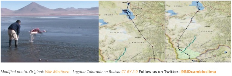 No, this is not some military project aimed at equipping wildlife with lethal capabilities. The project is actually harmless. It seeks to increase our knowledge of flamingo flight patterns in southern Bolivia, with the ultimate goal of better locating future infrastructure development in the region. To achieve that, we joined a group of field ornithologists to equip five adult Andean flamingos from Laguna Colorada, with ultra-light GPS transmitting devices and their flight routes monitored remotely by specialists from the IDB’s Environmental Safeguards Unit. Laguna Colorada is part of a wildlife reserve in the high Andean plateau that harbors three species of flamingos, including the threatened Andean flamingo (the only one with yellow feet). At the peak of breeding season, up to 23,000 birds -almost 60% of the entire population- can be found at this special place. But the spectacular natural beauty of this habitat is matched by its harshness. A bone-dry desert buffeted by severe winds, extreme temperatures and intense solar radiation, it took us three flights and a day-long ride on a 4×4 pickup truck in a cloud of dust to get there. At 5,000 meters above sea level, most of us were gasping for air. ‘Catching’ a flamingo was also a challenge. With only series of in-water fishing line loop knots to help us, it became quickly obvious that we needed to improvise a stakeout and watch the flocks dance around our traps for hours on end, every day, in the hope that one would step on a line loop at a certain angle and drag it along with one of their feet in order to be ‘volunteered’ as a GPS carrier.