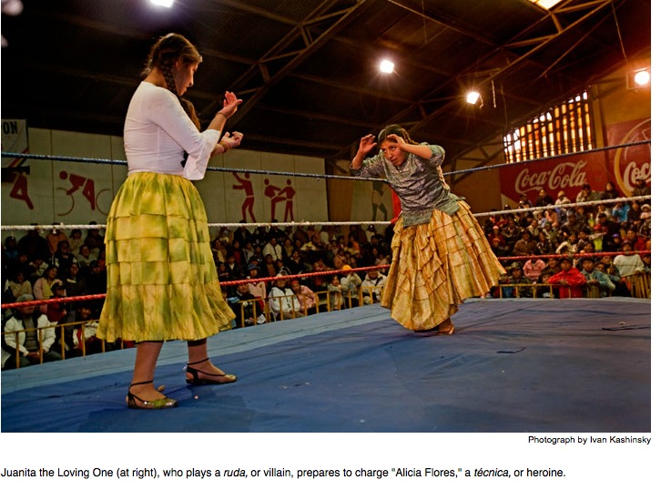 At the largest public gymnasium in El Alto, Bolivia, daylight is fading from the windows, and hundreds of people along the bleachers are growing impatient. They have been sitting for more than two hours now, jeering and whistling and yelling encouragement at the succession of artistas who have faced off in the center of the gym to match wits and perform dazzling feats of strength and skill. But it is growing late, and over the blaring disco music, foot-stomping and impatient whistles can be heard in crescendo: “Bring them on!” The music grows louder, the whistling too; there is a sense that rebellion may be about to erupt, but at last the houselights flash and dim, and the music shifts to the chunka-chunka beat of a modern Bolivian huayno. An announcer emotes into the microphone, the curtains leading to the locker rooms part, and “Amorous Yolanda” and “Evil Claudina,” this evening’s stars, make their longed-for appearance to ecstatic applause.