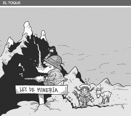 Deputy Minister of Mining Policy, Eugenio Mendoza, acknowledged yesterday that the decree that is being developed to curb the encroachment of mines will not solve the problem in its entirety, but said that the Jurisdictional Mining (AJAM) Authority shall manage and reverse the illegal taking of mineral deposits. [this cartoon reflects what the “new” mining law aims at… polluting without any mitigation, remediation plans. Illegal takeovers happen on legal concessions and after that, a coop is “formed” and as most of them support the coca-growers’ political party in power, they do as they please, from El Dia 03/31/2014]]