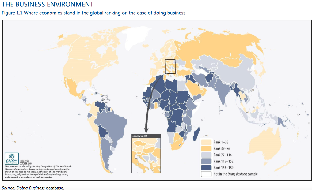 Note: The rankings are benchmarked to June 2014 and based on the average of each economy’s distance to frontier (DTF) scores for the 10 topics included in this year’s aggregate ranking. The distance to frontier score benchmarks economies with respect to regulatory practice, showing the absolute distance to the best performance in each Doing Business indicator. An economy’s distance to frontier score is indicated on a scale from 0 to 100, where 0 represents the worst performance and 100 the frontier. For the economies for which the data cover 2 cities, scores are a population-weighted average for the 2 cities. Source: Doing Business database.