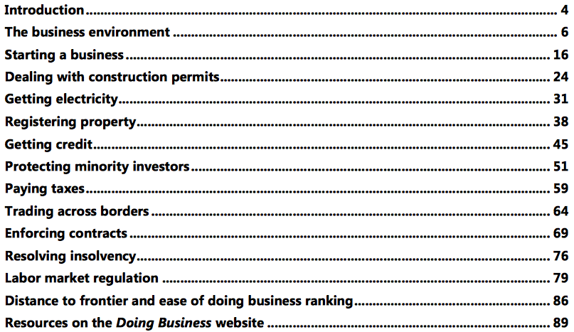 Doing Business sheds light on how easy or difficult it is for a local entrepreneur to open and run a small to medium-size business when complying with relevant regulations. It measures and tracks changes in regulations affecting 11 areas in the life cycle of a business: starting a business, dealing with construction permits, getting electricity, registering property, getting credit, protecting minority investors, paying taxes, trading across borders, enforcing contracts, resolving insolvency and labor market regulation.