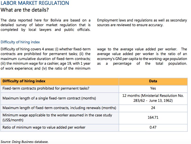 This economy profile presents the Doing Business indicators for Bolivia. To allow useful comparison, it also provides data for other selected economies (comparator economies) for each indicator. The data in this report are current as of June 1, 2014 (except for the paying taxes indicators, which cover the period January–December 2013).