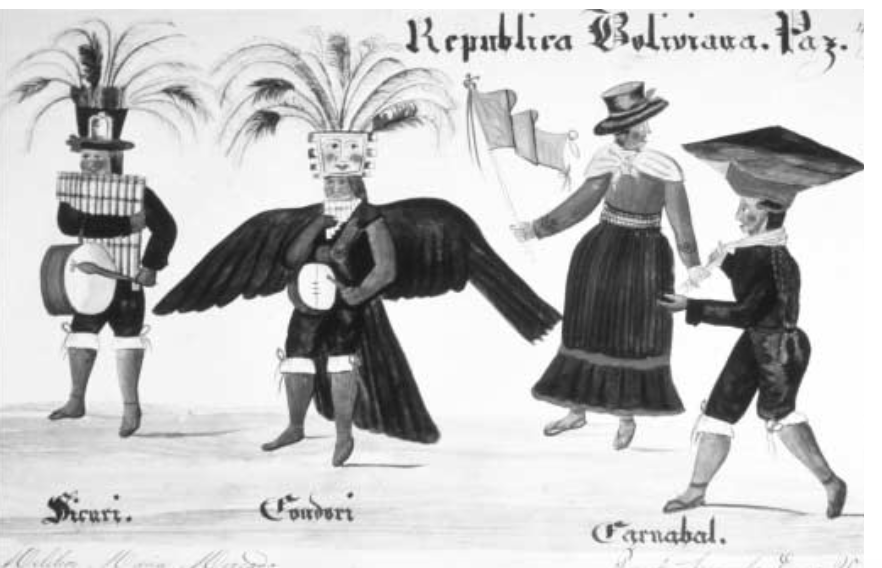 After Bolivia gained its independence from Spain in 1825, native Andean people were freer to participate in Carnival celebrations. Indians living in urban centers, such as La Paz, adopted European-style clothing for everyday and festival dress. Others from rural communities joined Carnival festivities playing Andean pan- pipes and wearing traditional costumes, such as the large feathered condor outfit shown here.