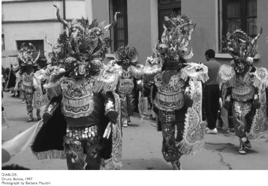 Samaké, Cynthia LeCount. “Dancing for the Virgin and the Devil: ‘Carnaval’ in Oruro, Bolivia.” Barbara Mauldin, ed. ¡CARNAVAL! Seattle: University of Washington Press, 2004. pp. 173 – 202.
