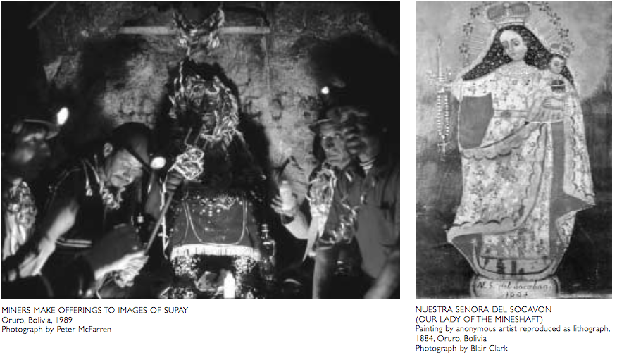 The indigenous people of highland Bolivia were mining the hillsides for hundreds of years before Spaniards came into the region. They believed that one of their deities, Supay, lived underground watching and controlling activities that took place there. The spirit’s attitude depended on proper respect, so workers made offerings to him in the mineshafts. When Catholic priests discovered this devotion to Supay they called him the devil and put horns on his images, but miners continued to wor- ship this spirit throughout the colonial period and still do today. In the mines around Oruro, the Friday before Carnival is a par- ticularly important time to honor Supay and miners gather to sacrifice a llama and place offerings around his shrines.