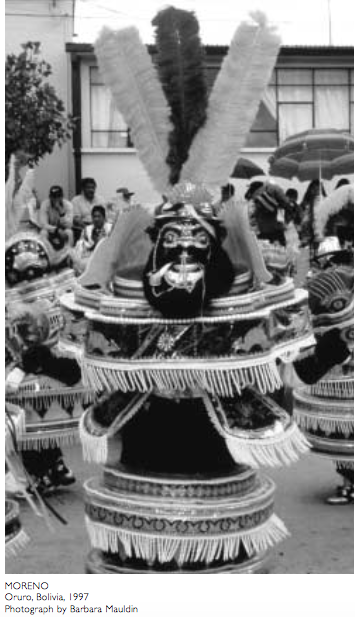 Oruro, a mining town in the stark altiplano region of Bolivia, 12,144 feet above sea level, was founded in 1606 by Spaniards as a base for exploiting rich mineral deposits in the surrounding hills. Aymara and Quechua people of this area were already working the local mines and became laborers for the Europeans. Spanish priests introduced Christianity, encouraging Indians to perform their traditional dances and songs for the Catholic saints’ feast day observances. By the mid-18th century carnaval became an annual event in Oruro. As Indian laborers joined the celebra- tion, city officials made efforts to control rowdiness by naming the Virgin Mary patron saint of the festival.