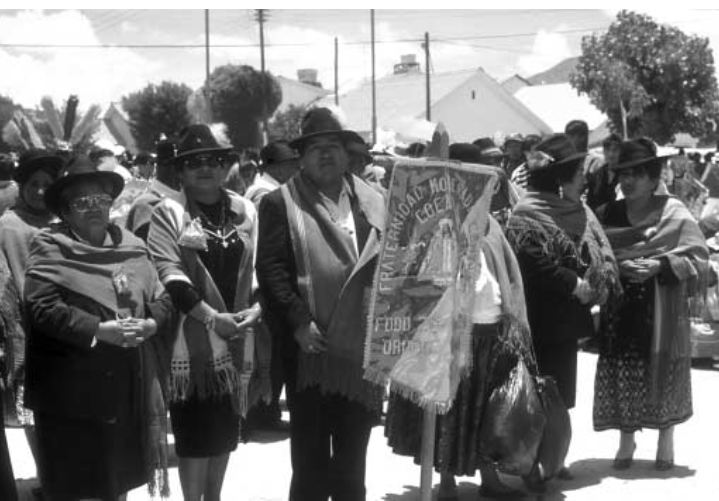 On Saturday the main event, the Gran Entrada de Peregrinación, begins about nine in the morning and continues for sixteen hours. Catholic priests followed by altar boys swing- ing lit incense burners lead the long procession which includes miners, dignitaries, and dance sponsors carrying a glass case con- taining a statue of the Virgin of the Mineshaft. The oldest diablo dance group (conjunto) then begins the parade. More than forty groups, each accompanied by bands, dance the entire parade route uphill through town, about 35 blocks, more than three kilometers, finally arriving at the plaza in front of the church of the Virgin of the Mineshaft.