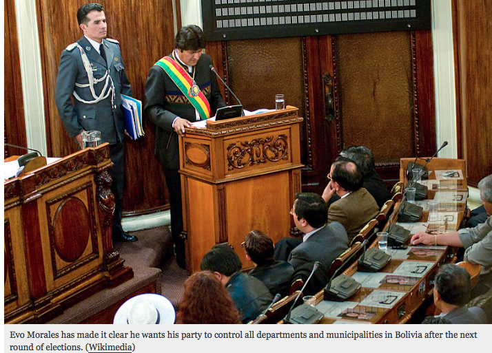 Unfortunately, Bolivia is a long way from a mature democracy, and a lack of education regarding political rights can be seen every day. Before October’s presidential elections, Evo Morales asked the candidates from his party to gain an absolute majority in Parliament (which they did); and he recently expressed his desire to gain control over all nine Bolivian departments and 339 municipalities in the next round of local elections. At present, MAS controls seven departments and 289 municipalities.