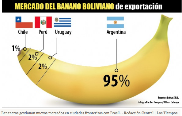 The general manager of the company Befrut SRL, Roger Mérida, said banana exporters ARE seeking to expand their markets given that exports to Argentina, the natural market of Bolivian bananas, have been reduced over the last three years ago due to restrictions imposed in that country. [so much goes for the “alleged” brotherhood between current Bolivian president with the Argentinian President… the former spending a million dollars to place an statue in Buenos Aires and does zero to help the banana exporters?!]