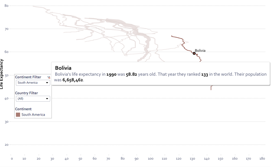 The author writes: “Great vizzes often lead to the discussion of “how they do that?” and the beautiful thing about Tableau Public is that you can download and reverse engineer it to see what’s going on. Being the curious fellow that I am, I did exactly that and found some interesting things. I also thought it would be interesting to look at the data with a slightly different X-Axis, simply the countries’ rank of life expectancy, which in effect creates a massive bump chart.”