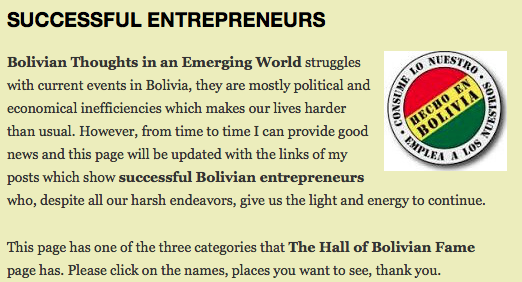 From the Editorial section of Pagina Siete: Products made in Bolivia Hecho en BoliviaA packaged llajua [spice sauce made mainly with locoto/Capsicum pubescens and tomato], packaged pasankallas [sweet popcorn type] or singani [spirit made with distilled grapes, better than pisco] promoted by American film director and a long list of other innovations, are some examples of the presence of Bolivian products abroad. Exports of goods and their sale in foreign supermarkets now bears the name of Bolivia to more than 20 countries worldwide. [this report forgot quinoa; our star product of this century, read about it at the end of this post] In recent years, various industrial manufacturing companies have begun to market their products in neighboring or are installing plants or factories in other countries. The reasons have to do with the international expansion of the brand “made in Bolivia” which has gained prestige in certain accounts for their quality and competitive price. It also has to do with the increasing regional demand for goods, product boom Economic lived in recent years and finally also due to innovative initiatives of Bolivian entrepreneurs. Good news for the country, whose dependence on the sale of raw materials has been a drag, which may be starting to escape from these developments. http://www.paginasiete.bo/opinion/2015/3/12/productos-made-bolivia-49811.html This blog has a special page to show our entrepreneurial success: Screen Shot 2015-03-17 at 10.06.58 AM
