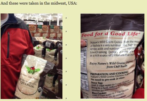 You can go directly to that page by clicking above in the main menu of this blog, or using this link, thank you. Now the QUINOA:Screen Shot 2015-03-17 at 10.31.39 AM Now, you can find quinoa at major restaurants, as fancy servings; packed like yogurt with fruits at supermarkets. In sum, quinoa has taken over the US market. Lets not forget that the Quinua Real is registered worldwide as originated in Potosi, Bolivia. Screen Shot 2015-03-17 at 10.31.48 AM To read full post, use this link, thank you!