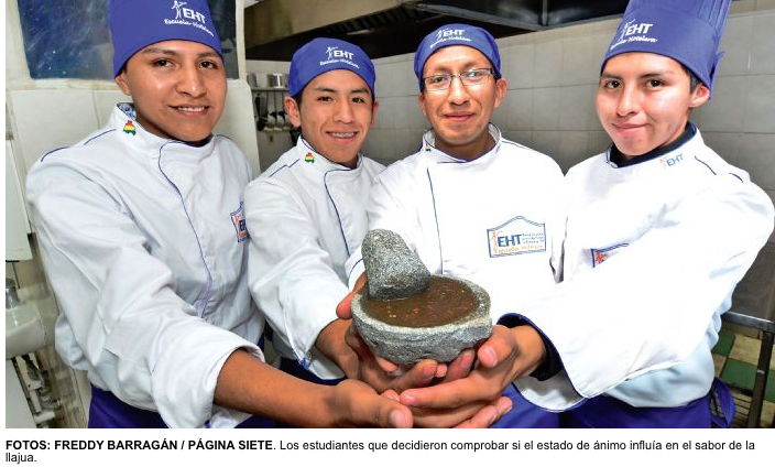 A group of students from the Escuela Hotelera [Hotel School] in La Paz, conducted an experiment to test the mito. Could a grumpy person make a spicier llajua? A group of students from the first half of the Gastronomy Professional career at the Escuela Hotelera in La Paz decided to find out if the story they hear from the time of their grandmothers was true.