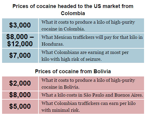 In Bolivia, the Colombians can produce a kilo of high-quality cocaine, using Peruvian base, for less than $2000. That same kilo in São Paulo or Buenos Aires is worth as much as $8000. Thus, the Colombians can earn more than $5000 a kilo with minimal risk of interdiction and almost no risk of extradition simply by moving drug consignments across the Bolivian border into Brazil or Argentina.
