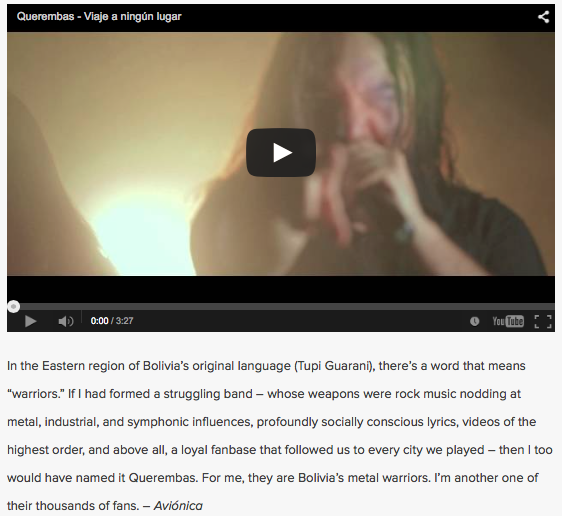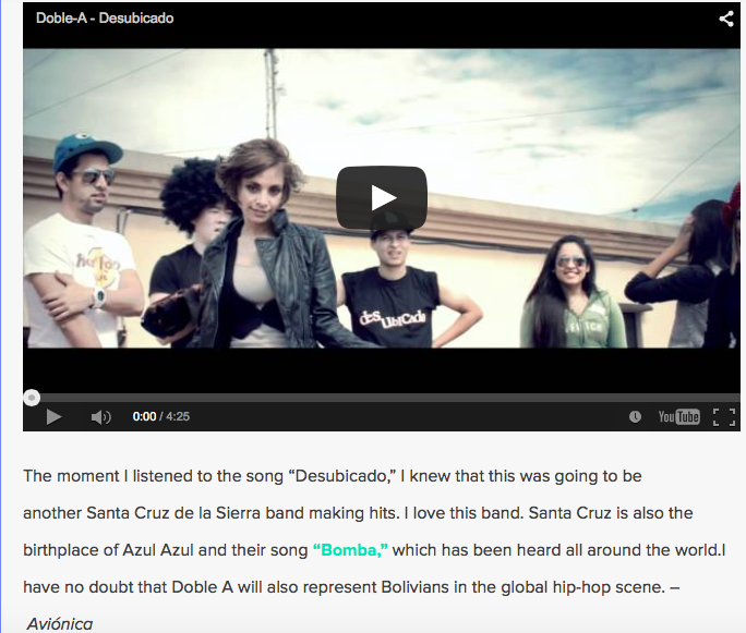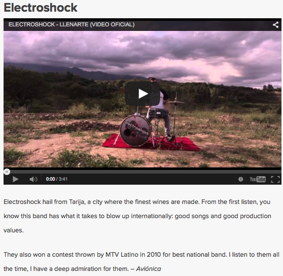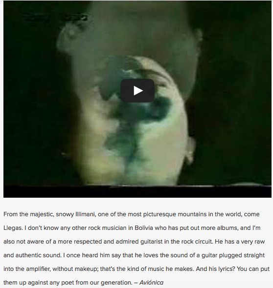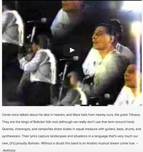 From remezcla.com, a great opportunity to watch and listen Bolivian music, endorsed by Aviónica [to watch videos, please use this link]: