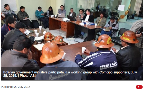 Negotiations began Sunday, after violent clashes erupted July 22 between police and members of the committee, known by its acronym Comcipo. The committee’s supporters attacked the offices of the interior minister with sticks of dynamite in the Bolivian capital of La Paz, resulting in the arrests of 51 demonstrators and one person injured. In a good faith gesture the government released 47 of those detained.