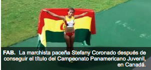 The La Paz walker Stefany Coronado got the gold medal yesterday for Bolivia, in the Pan American Junior Athletics Championships that was held in Edmonton (Canada).