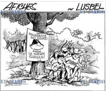 Well, the cartoon reads: “unwelcome president to the Guarani nation” … as the acts of this politician who tries to perpetuate in power has relentlessly pushed indigenous people inside their territories, searching for oil and gas…