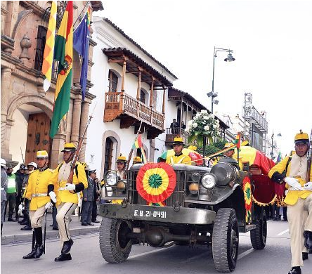 Immediately afterwards, the remains were taken, by air, from Lima to Sucre. They came to Juana Azurduy Airport at 16:00 and a group of students received them with national flags aloft. Half an hour later they entered the main Plaza 25 de Mayo in an open carriage.