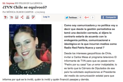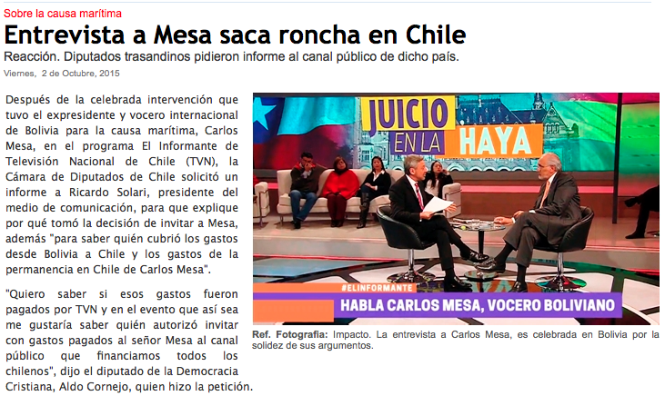 “After the intervention that had held the president and international spokesman for the maritime cause for Bolivia, Carlos Mesa, in The Informant National Television of Chile (TVN) program, the Chamber of Deputies of Chile requested a report from Ricardo Solari, president of the media, to explain why he took the decision to invite Mesa also “to know who covered the costs from Bolivia to Chile and the cost of the stay in Chile for Carlos Mesa.””