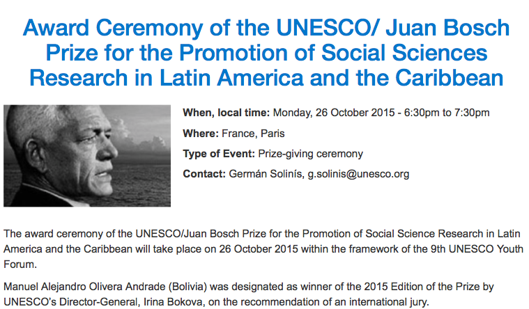 Manuel Olivera Andrade, young Bolivian researcher, receives the UNESCO/Juan Bosch Prize for the Promotion of Social Science Research in Latin America and the Caribbean, on Monday, 26 October 2015, at UNESCO Headquarters, Room I, at 6:30 pm. The ceremony is part of the 9th UNESCO Youth Forum, which brings together more than 500 young people from all over the world to focus on issues related to sustainable development and global citizenship.
