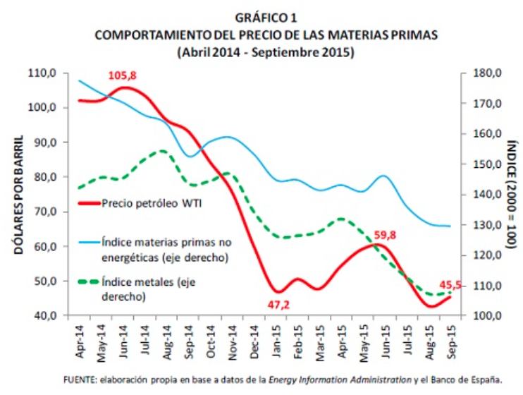Since mid-2014 the price of oil fell sharply. Although it seems that it bottomed out, this is not safe unlike what happened in 2009 due to the international economic crisis. But not only oil prices shrank, minerals and non-energy commodities in general also experienced steep declines in prices (see graph 1). The metals prices had a downward trend with a heavy reduction until September 2015. Given the current context, the persistent decline does not appear to be transient but rather a price correction that could last several years. This drop could worsen if the US FED (central bank) raises interest rates.