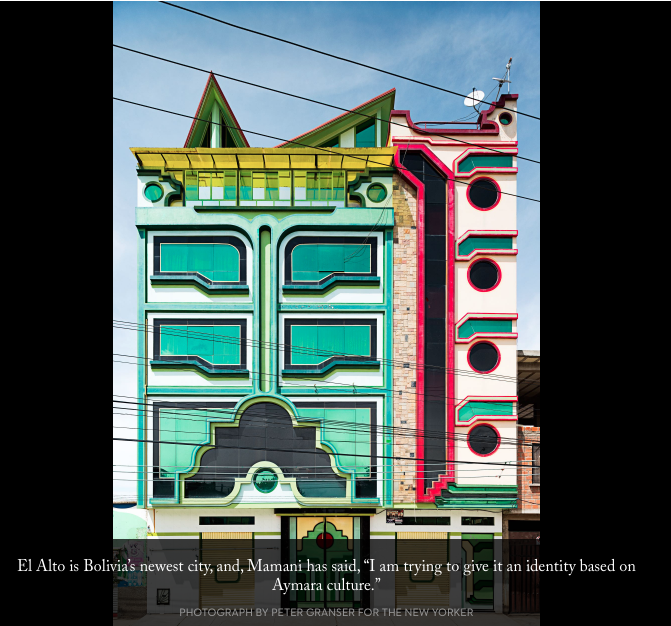 The Bolivian architect Freddy Mamani Silvestre doesn’t have an office, use a computer, or draw formal blueprints. He sketches his plans on a wall or transmits them orally to his associates. Since 2005, Mamani and his firm have completed sixty projects in El Alto, the world’s highest city, which sits at nearly fourteen thousand feet, on an austere plateau above La Paz. In the past twenty years, the economy there has burgeoned, along with an enterprising, mostly indigenous population. Mamani earned his fame building mixed-use dream houses for the city’s nouveaux riches.