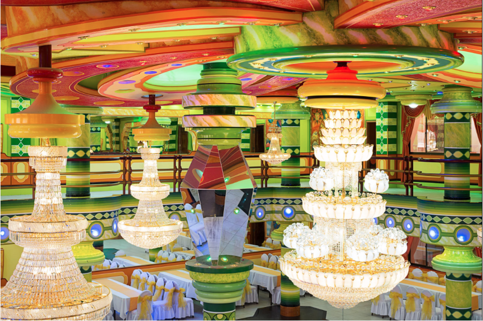 Each of his houses has a futuristic façade, a commercial ground floor with jazzy shop fronts, a baroque party hall on the mezzanine, a story or two of apartments, and an owner’s penthouse. This aerie is sometimes called a cholet, a pun on the words “chalet” and “cholo”—a dismissive racial epithet that cholos like Mamani have proudly embraced. Mamani’s architecture incorporates circular motifs from Aymara weaving and ceramics and the neon colors of Aymara dress, and it alludes to the staggered planes of Andean temples. But it has also been inspired by science fiction, particularly by the Transformer movies. It might be called, like the second film in the saga, “Revenge of the Fallen.”