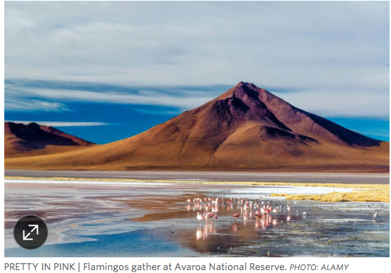 After more than 9 hours of driving and exploring, we felt as if we were crossing a marathon’s finish line when we finally reached the Reserva Nacional de Fauna Andina Eduardo Avaroa, a 2,700-square-mile protected area. Inside the reserve, we stopped at the broad, shallow, mineral-red Laguna Colorado, which was half-covered with ice and filled with flamingos that took flight in groups, showing off their dramatic black underwings as they rode the wind.