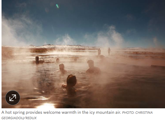 That night, Mr. Alcerreca, wearing a tiny swimsuit, led us to a hot spring on the edge of the lagoon. It was ringed by stones and had a soft, sandy bottom. We slipped in and stared up at the moon and the stars. It was quiet, still and wonderfully warm. Our stiff, frozen, jeep-jostled bodies softened in the heat, our bones dissolved into jelly. We soaked until we were shriveled and dizzy.