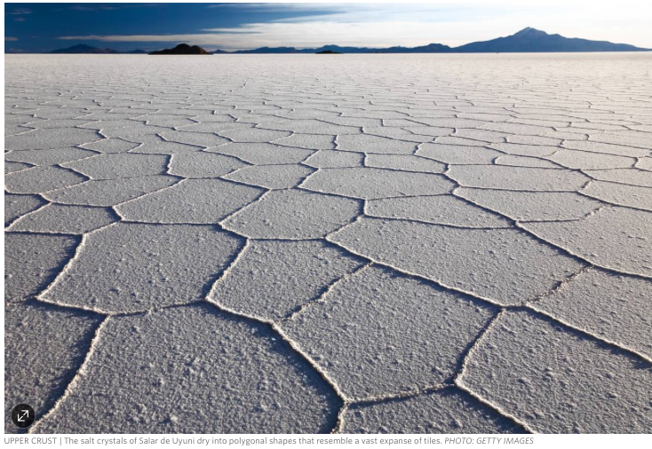 We climbed into our Land Cruiser and took off into the salar. The low, jagged silhouette of the Bolivian Andes floated on the horizon like a hallucination. The ground had dried into a pattern of polygons that looked like tiles laid by the gods, each big enough to curl up in. We were surrounded by a whiteness as vast as a frozen ocean.